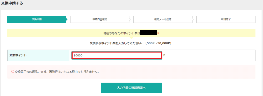 その後、交換したいポイント数を入力し、画面の指示にしたがって進んでいけば、申請は完了です。