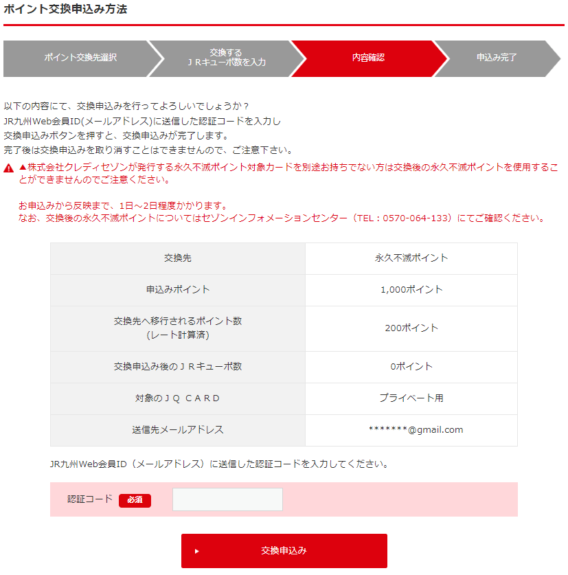最後に申込み内容の確認をし、「交換申込み」ボタンをクリックすれば、JRキューポから永久不滅ポイントへの交換は終了となります。