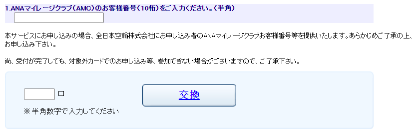あとは、ANAマイレージクラブ(AMC)のお客様番号(10桁)と、交換口数を入力し、「交換」をクリックするだけです。
