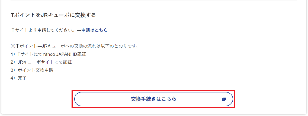 Vポイント公式サイト内のJRキューポへのポイント交換ページを開き、「VポイントをJRキューポに交換する」の部分から「交換手続きはこちら」を開きましょう。