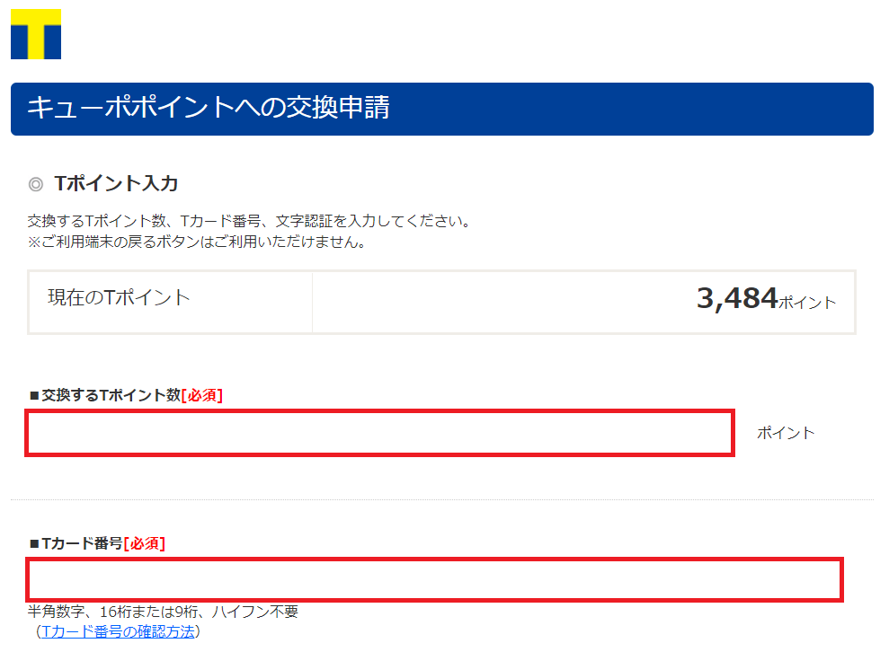 「キューポポイントへの交換申請」ページまで進んだら、あとは「交換するVポイント数」と「Vカード番号」を入力するだけです。