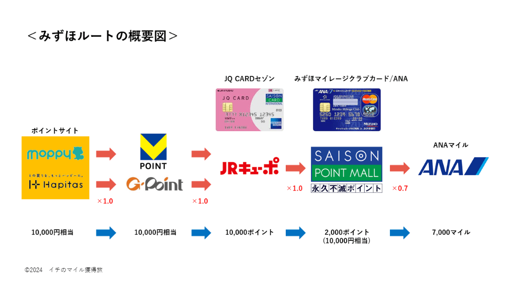 この「みずほルート」について、実際のANAマイルへの交換方法(上図の4つの青矢印部分)を解説していきます。